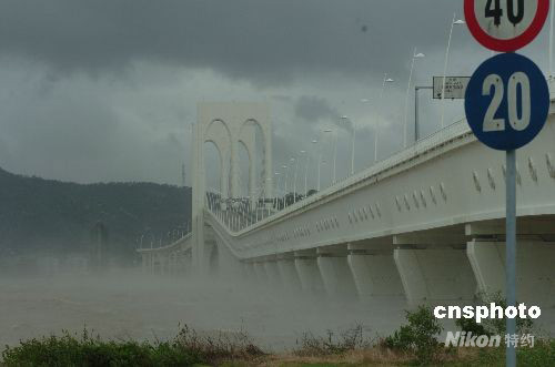 八月六日上午,受热带风暴“北冕”影响,澳门挂出八号风球,三座连接半岛和离岛的大桥桥面关闭,唯图中西湾大桥的下层通道可供车辆使用。中新社发 毕永光 摄
