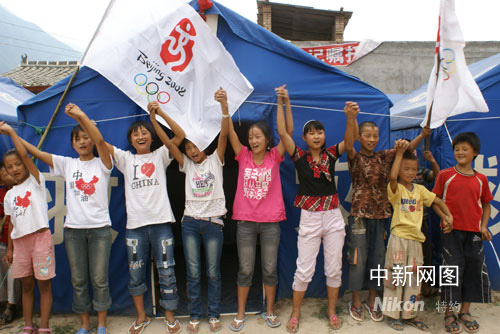 8月7日这天,重灾区文县城关镇元茨头村清水坪社住在帐篷内的一群孩子在帐篷前手拉手唱起了《北京欢迎您》 ,为北京奥运加油!为平安奥运祝福!以此表达了灾区人民盼奥运的心情。作者:司小平