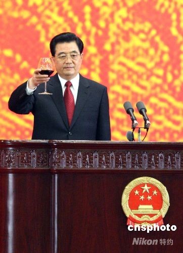 图:胡锦涛在北京奥运欢迎宴会上祝酒