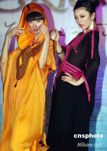 8月10日,第29届奥运会在北京举行之际,“突尼斯旅游文化周”在北京举行,来自“突尼斯的艺术家、音乐家、舞蹈家、烹饪大师、商业代表以及政府代表组成的代表团,以音乐节、美食节、商务研讨会等多种形式,为中国及各国各界的宾客呈现一个全方位、全视角、多层次、丰富多彩的突尼斯新形象。图为模特展示突尼斯时装设计师创作的服饰作品。中新社发 钱兴强 摄
