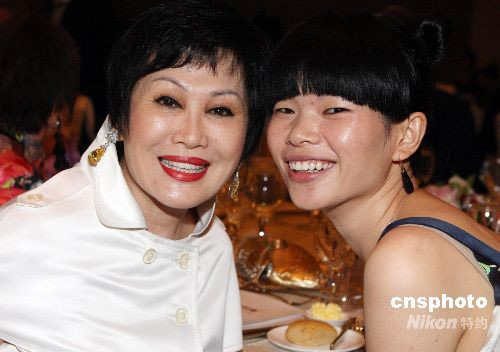 图为美籍华人靳羽西与中国模特吕燕亮相北京突尼斯旅游文化周。 中新社发 钱兴强 摄