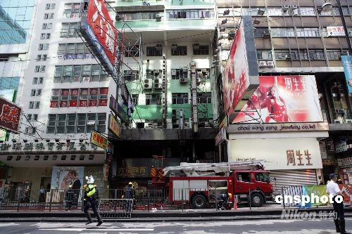 八月十日下午三时许,香港旺角嘉禾大厦的五级火警被救熄,此次大火中两名消防员殉职,一名老妇死亡,另五十六人受伤。火警在当天九时许发生,焚烧了近六个小时。中新社发 洪少葵 摄