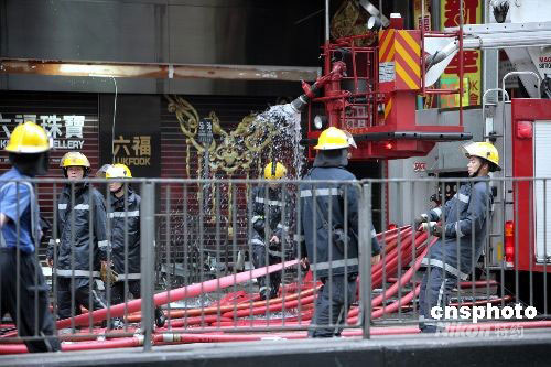 十日上午九时许香港旺角嘉禾大厦发生五级火警,焚烧了近六个小时的大火在下午三时许救熄,火警中两名消防员殉职,一名老妇死亡,另五十六人受伤。中新社发 洪少葵 摄