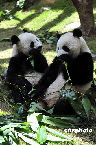 图为乐乐(左)及盈盈正在享受“美食”竹叶。中新社发 谭达明 摄