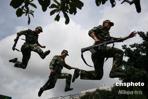 八月十二日,武警福建总队泉州支队官兵在训练场上进行高难度跨越追捕、居民房协同战术等内容为主的处突演练。连日来,该支队针对备战奥运安保,突出以强化训练、贴近实战磨砺反恐尖刀。中新社发 张九强 摄