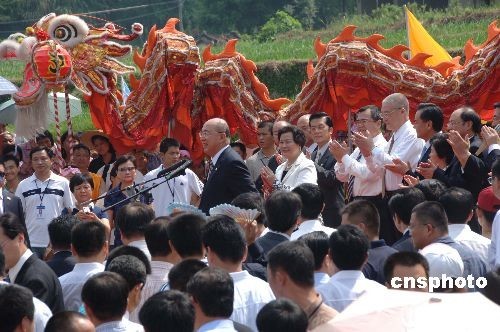 中国国民党主席吴伯雄回到福建永定县下洋镇思贤村谒祖,受到家乡父老的欢迎。中新社发 郑祚声 摄