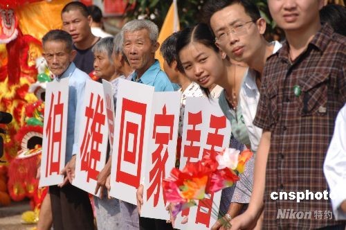 图为乡亲打出“伯雄常回家看看”的横幅。中新社发 郑祚声 摄
