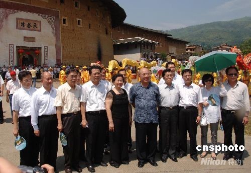 八月十四日下午,中国国民党主席吴伯雄一行来到“土楼之乡”福建永定县的高北土楼群参观游览,在“土楼王”承启楼前合影留念。中新社发 郑祚声 摄