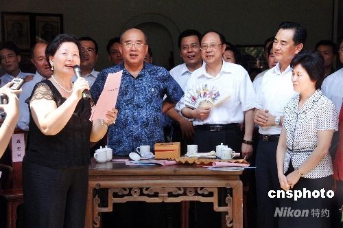 八月十四日下午,中国国民党主席吴伯雄一行来到福建永定县的高北土楼群参观游览,吴伯雄夫人戴美玉女士(左一)在“侨福楼”里即兴演唱客家山歌。中新社发 郑祚声 摄