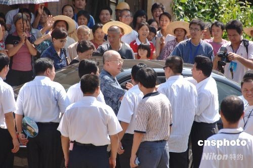 八月十四日下午,中国国民党主席吴伯雄在福建永定县的高北土楼群参观完后,上车前与乡亲话别,随后乘车赶赴厦门。中新社发 郑祚声 摄