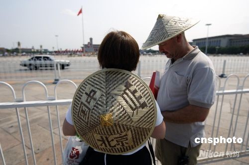 8月18日,北京天气晴好,外国游客头戴斗笠游北京。中新社发 王东明 摄