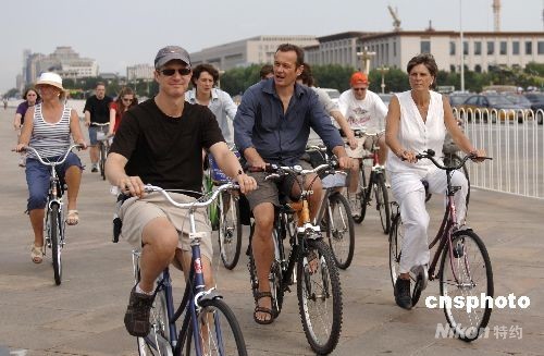 8月18日,北京晴空万里,外国游客集体骑自行车在北京街头游玩。中新社发 王东明 摄