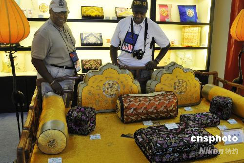8月21日,北京故宫博物院的“皇家饰品”商店迎来了海内外顾客。商店内销售的均为仿清朝宫廷风格的各式靠垫、睡衣等丝绸锦缎手工制品。美国游客安东尼和查里对商店里清代皇家风格的刺绣纹饰摆件情有独钟。中新社发 王宇婷 摄