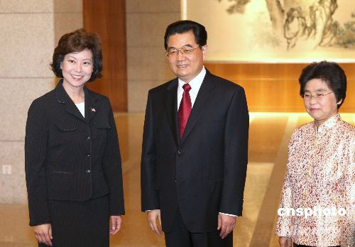 胡锦涛夫妇欢迎出席闭幕式的美国劳工部长赵小兰