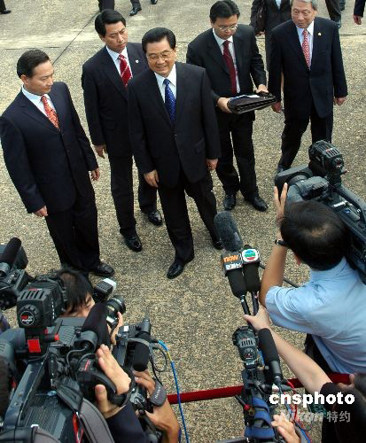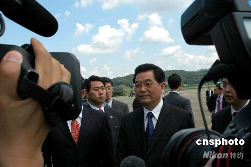 中国国家主席胡锦涛八月二十五日中午抵达韩国首都首尔,胡锦涛在机场对记者发表讲话。
