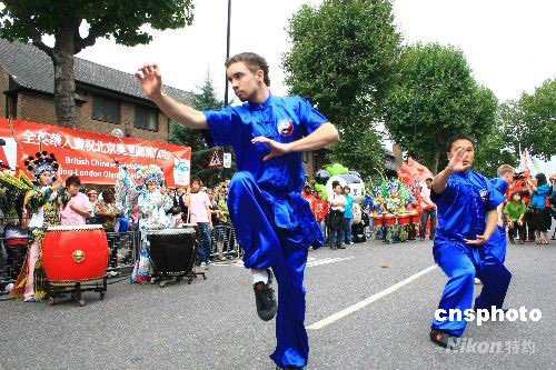 当地时间25日,欧洲最大规模的街头文化艺术节——一年一度的英国诺丁山狂欢节在伦敦举行,今年的主题是“欢迎世界”。图为当地青年在表演中国武术。中新社发 李鹏 摄
