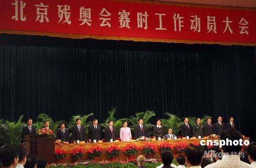8月26日,北京残奥会赛时工作动员大会在北京人民大会堂举行。定于9月6日开幕的北京残奥会将是历史上参加国家和地区最多的一次,届时将有来自近150个国家和地区的4000多名运动员参加赛事。 中新社发 孙自法 摄