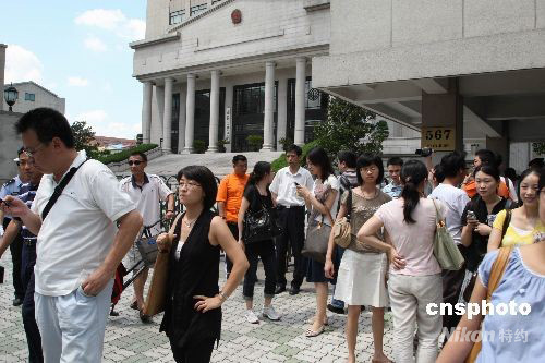 8月26日,上海第二中级法院电子信息牌上公告,轰动沪上的“杨佳袭警案”将在下午一点开庭。众媒体被谢绝现场旁听,许多媒体记者在法院门口观望采访。今年7月1日,北京籍男子杨佳闯入上海市闸北区政法办公大楼,连续捅伤9名民警和一名保安,并致其中6名警察身亡,杨佳被当场擒获。中新社发 潘索菲 摄