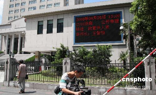 8月26日,轰动沪上的“杨佳袭警案”在上海第二中级法院开庭。图为法院门前的电子屏幕上显示为当日下午一点开庭信息。中新社发 潘索菲 摄