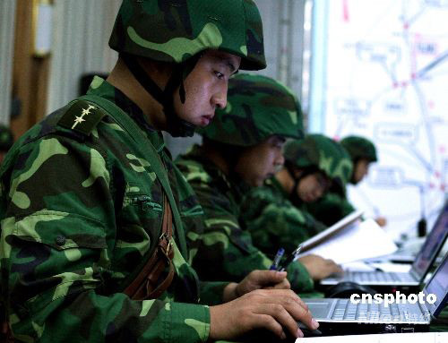 中国人民解放军“励兵--2008”演练8月26日拉开帷幕。当日上午济南军区某机械化步兵旅指挥机关向所属部队下达了进入战备状态命令,部队迅速进入战位严整以待,战备状态将随时升级。中新社发 宋吉河 摄