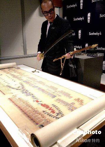 专家正在介绍珍稀乾隆御制《大阅第三图 阅阵》手卷,及清乾隆御制金桃皮鞘“天字十七号”“宝腾”腰刀。中新社发 张勤 摄