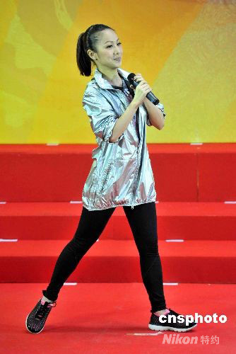 八月二十七日,第二十九届奥林匹克运动会中国香港代表团返港欢迎仪式在香港文化中心举行。图为歌星郑融唱歌助兴。中新社发 谭达明 摄