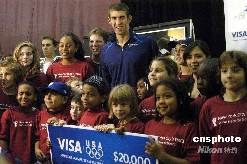 美国游泳运动员菲尔普斯28日出现在纽约青年会游泳馆,参加为推进儿童游泳项目而进行的一项捐款活动。他说,“孩子们应该在安全、设施完好的地方进行锻炼,追求他们自己的奥林匹克梦想”。中新社发 魏晞 摄
