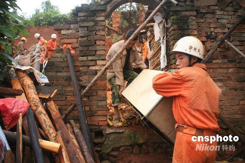 消防战士帮助受灾村民转移物资。中新社发 王川源 摄