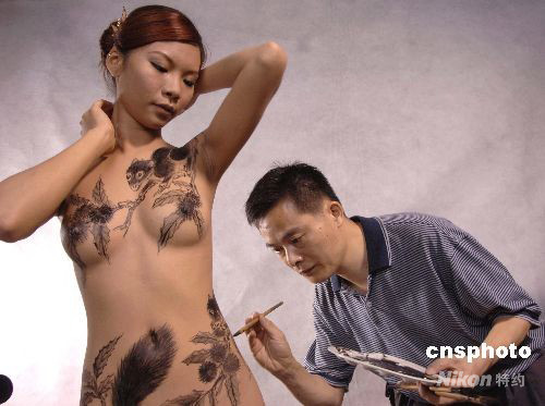 九月六日,“庞国华人体彩绘艺术摄影大赛”在广州昊源摄影城举行,模特身上的人体彩绘艺术作品吸引不少广州摄影人士的镜头。图为庞国华大师正在进行人体彩绘艺术创作。中新社发 梁永强 摄