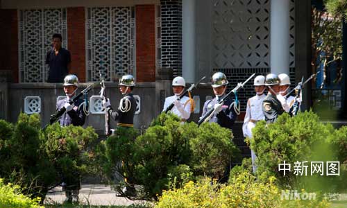 9月7日,台湾慈湖两蒋文化园区中仪仗队正在蒋介石陵寝大门前表演节目。曾福志 摄影