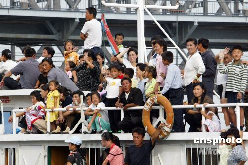 9月9日正值朝鲜国庆,朝鲜新义洲民众有组织地乘船游览鸭绿江。中新社发 陈浩浩 摄