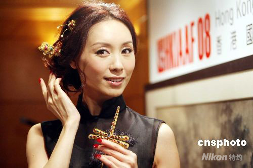 九月十日,香港艺人郭可盈展示明代黄金发饰。当日,香港国际艺展公司向传媒预展一批将在十月四日在“2008香港国际古玩及艺术品博览会”上拍卖的珍品。中新社发 洪少葵 摄