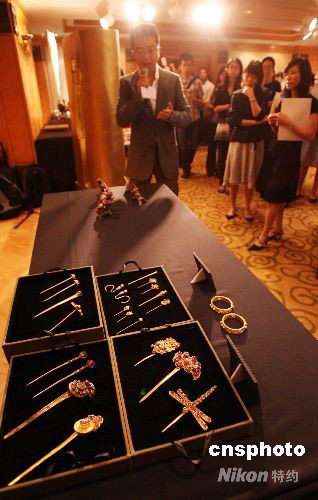 九月十日,香港国际艺展公司向传媒展示一套华美精巧的黄金发饰,估计拍卖价在八百万港元。该公司主办的 “2008香港国际古玩及艺术品博览会”将在十月四日至七日在会展中心举行。中新社发 洪少葵 摄