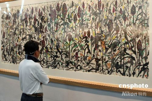 9月10日,2008上海艺术博览会开幕。本届艺博会吸引了来自中国、美国、法国等20个国家的140余家优秀画廊前来参展。图为吴冠中代表作《高粱》吸引参观者。中新社发 汤彦俊 摄