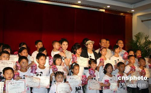 9月11日,香港华光功德会在绵阳成立“华光四川助学基金”,香港华光功德会的荣誉顾问袁咏仪、爱心大使赵薇与绵阳地震灾区学生合影。中新社发 霍潺 摄