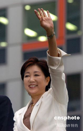 9月11日,出战日本自民党总裁选的石原伸晃、小池百合子、麻生太郎、石破茂和与谢野馨开始为期十二天的全国巡回演讲。作为第一站,五名候选人齐聚东京繁华大街涩谷阐述各自的政治主张。图为坚持小泉改革路线的小池百合子向支持者挥手致意。中新社发 朱沿华 摄