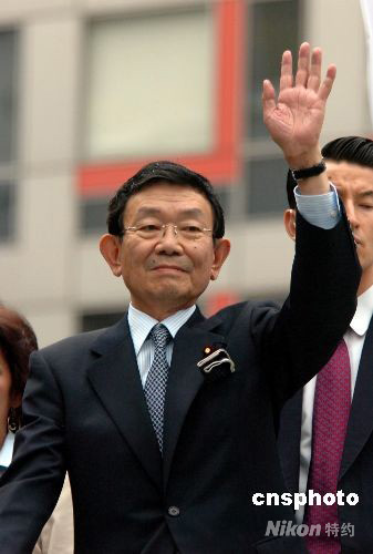 图为主张改革社会保障与消费税制的与谢野馨向支持者挥手致意。中新社发 朱沿华 摄