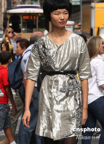 图为在纽约曼哈顿街头中国名模李峥展示设计师罗峥作品。中新社发 钱兴强 摄