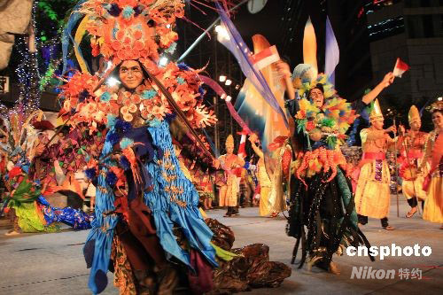 9月13日晚,海外民间舞蹈在上海淮海路上巡演,为上海旅游节开幕助兴。