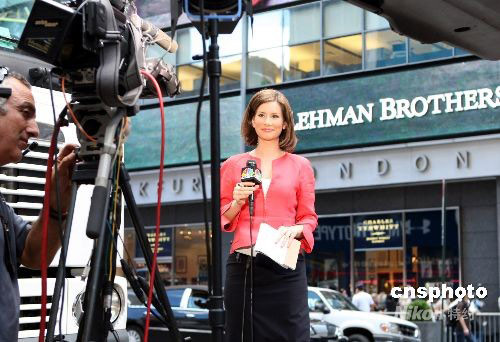 9月15日,美国有着158年历史的第4大投资银行雷曼兄弟公司向法院申请破产保护,当日纽约各大媒体的数十辆转播车移师到雷曼兄弟公司总部外,全天候报道这一震惊华尔街的经济事件。中新社发 邓悦 摄