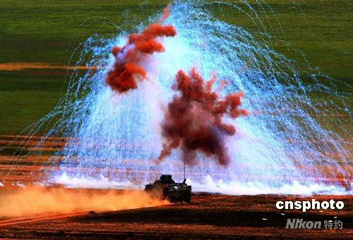 9月16日,中国人民解放军参加“砺兵--2008”演习部队进行实兵对抗训练。训练依山地复杂地形进行机械化立体进攻、防守,突出机械化、信息化、立体化现代作战特点。中新社发 宋吉河 摄