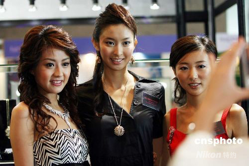 九月十八日,应届香港小姐冠军张舒雅、亚军陈倩扬及季军马赛应邀到“香港珠宝钟表展”上,为香港珠宝制造业厂商主办的“2008首饰设计比赛”担任评判。中新社发 洪少葵 摄