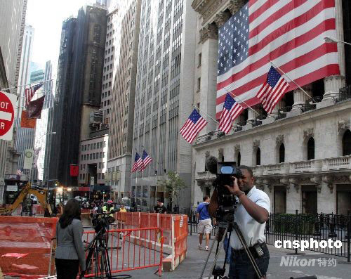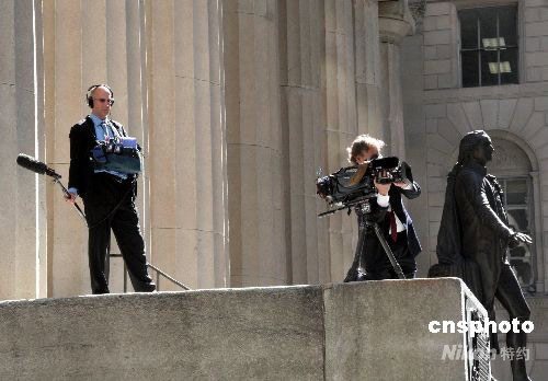 华尔街连日来大事连连,成为全世界媒体关注的新闻热点。9月19日,多家媒体守候在纽约证券交易所门外,随时准备播报华尔街第一手动态。中新社发 魏晞 摄