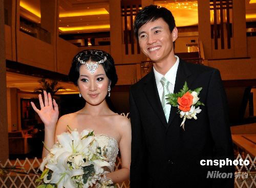 2008年9月19日,2008北京奥运会男子佩剑冠军仲满的婚礼在南京紫金山庄举行。江苏省体育局局长殷宝林、奥运冠军陈若琳、吴静钰、邱健等众多好友出席了婚礼,为新人送上祝福。中新社发 刘建民 摄