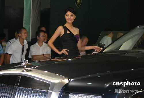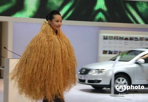 第11届成都国际车展向媒体开放,一美女车模着“稻草”装现身。 中新社发 霍潺 摄