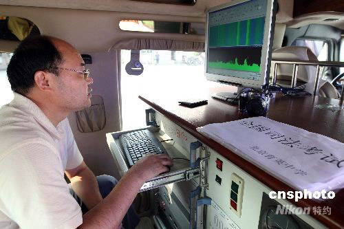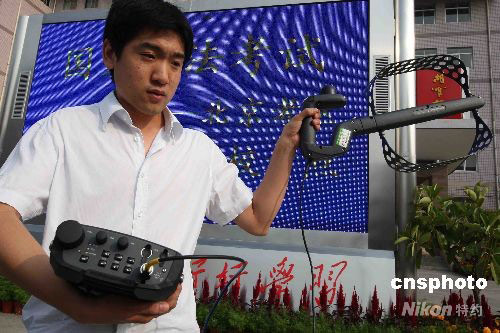 北京市司法局与北京市无线电管理局等按照“人防”与“技防”相结合,采用新型的技术设备--无线耳机探测器和全功能考场信号扰断仪配备给考点。对疑似利用无线电通讯设备作弊或与考场外无线电通讯设备串通作弊的信号进行监测,必要时采取技术手段予以阻断。对已经确认,情况属实,违反治安管理规定或涉嫌犯罪的,交由公安机关依法查处。中新社发 任海霞 摄