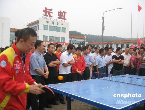 9月20日,中国体育总局乒羽中心主任刘凤岩、男乒主教练刘国梁、女乒主教练施之皓、队员张怡宁、马琳、王皓、王励勤等一行15人带着奥运金牌、荣誉、喜悦和祝福,前往四川绵阳长虹培训中心看望慰问在汶川大地震中遭受重创的北川中学学生。图为马琳等队员与学生们切磋球技。中新社发 肖青 摄