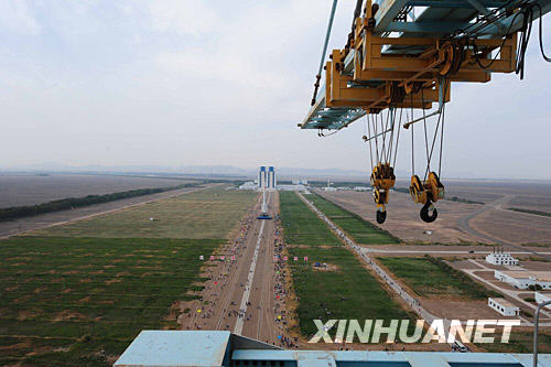 这是转运现场。 9月20日15时15分,神七载人飞船、长征二号F运载火箭和逃逸塔组合体,顺利垂直转运至发射区,标志着神七任务已进入最后的发射准备阶段。 新华社记者 李刚 摄