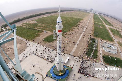 备受瞩目的神舟七号载人航天飞行任务实施在即,目前,神舟七号船、箭、塔组合体已顺利垂直转运至中国载人航天发射场发射架,整装待发。中新社发 杨志远 摄