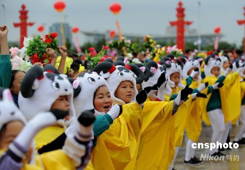 9月22日,中央人民政府向宁夏回族自治区赠送民族团结宝鼎仪式在银川举行,当地少年儿童扮作“羊宝宝”欢迎中央代表团。中新社发 廖攀 摄